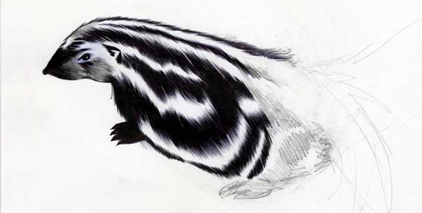 One evening at dusk, I spotted two adorable skunk kits wrestling on the ground under the apple tree beside the studio. I regularly saw the distinct black and white striped animals loitering around my compost, usually at dusk or dawn. I sometimes heard rustling noises beneath the floorboards as I tapped on my keyboard.