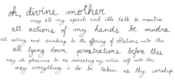 I’d first heard this prayer read aloud during Savasana at the end of a yoga class. The last line, May everything I do be taken as Thy worship, prodded my heart and nudged a yearning within me. It evoked longing, the desire to transform my life so that every act would be in service to the Divine. The word “worship” took on new meaning and has evolved to mean, for me, that connection with the divine presence, the longing to know oneness and to serve that consciously.